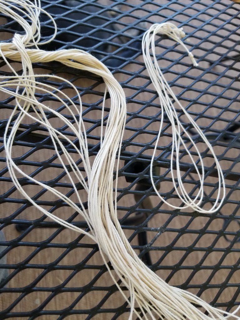 Today has a gorgeous, lazy morning after weeks of crummy weather. It’s the perfect moment for license plates. Even the chicken decided to sleep in. I’m on the porch listening to the forest critters back up Corrine Bailey Rae and Norah Jones on my speaker while I tie heddles for my new inkle loom. Forty heddles. I can hear weavers out there laughing because 40 is nothing for most weavers. I’m new to inkle loom weaving, and these heddles definitely could count as making license plates. Fortunately, I have an absurdly heavy dog head drooling on my foot, the rest of the house is doing their thing, and I am hanging out with the birds enjoying the peace and quiet. I’m guessing that tying this forty knots is going to feel pretty angelic.