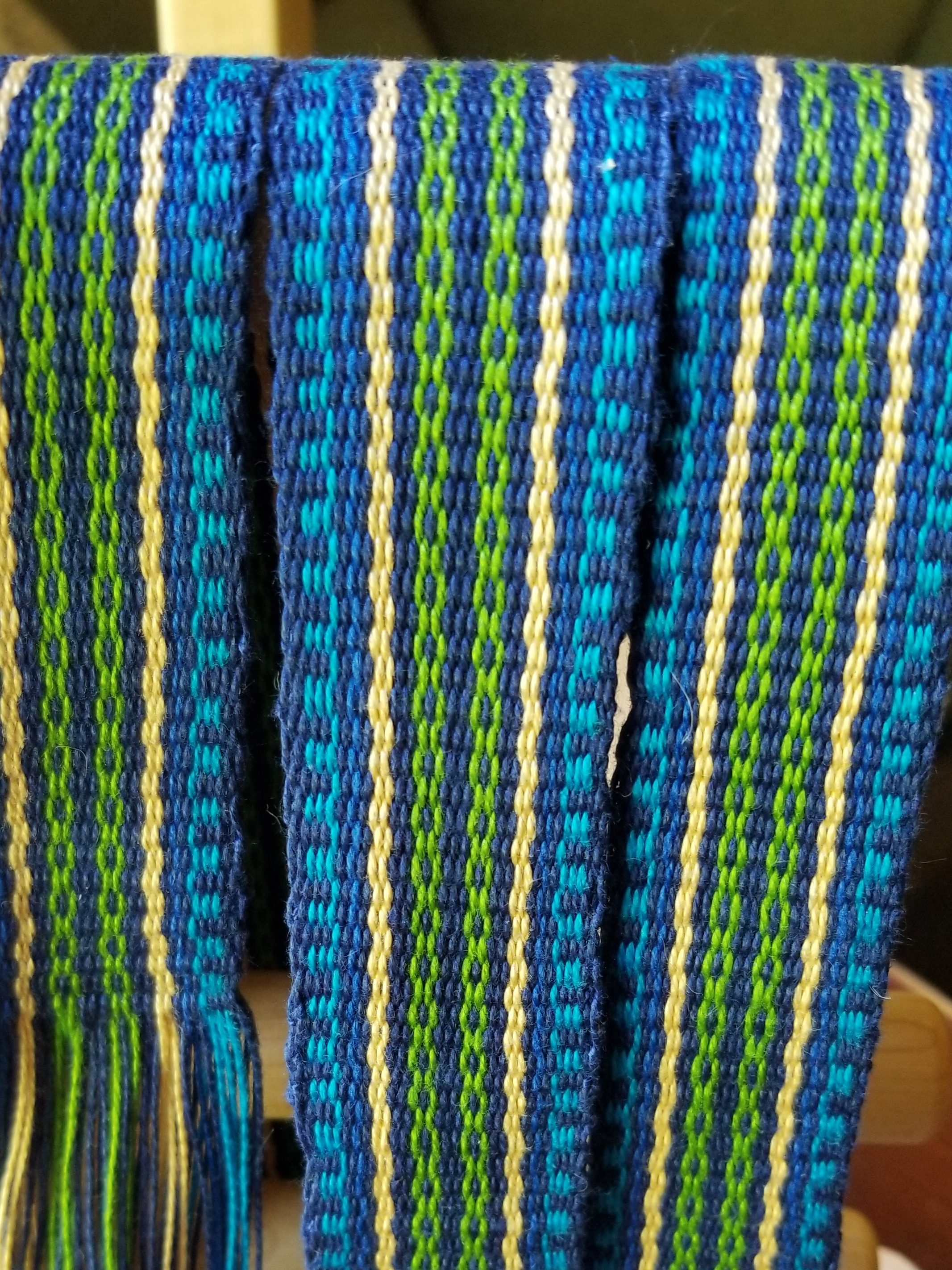 THE SPECS: 62 threads of 5/2 perle cotton woven on a Schacht inkle loom. Warp Length: 60″ Woven Length before drying: 43″. Width: 1.3″ Waste” 7″