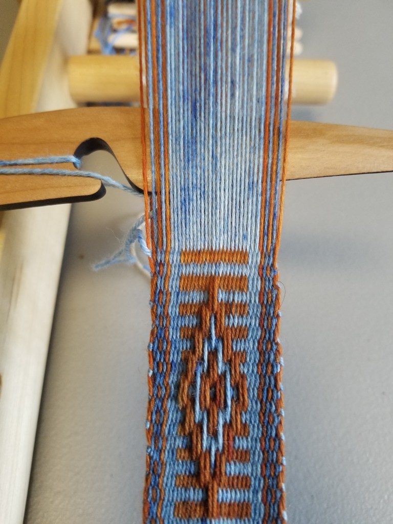 BEATING AND TENSION: The various info I could find on how to weave bands was not super helpful. Beat- not too hard, not too soft. Tension so that the edges stay even and snug, but not too snug and don’t pinch them in. I’m still incredibly new to this, but what is working for me is to beat so that a gentle pull slides the edge loop into place without it popping. If it pops into place, then I make a little pucker on the edge. At first I thought that was what I was after, but then I realized I had the tension on the warp too tight. I backed off a smidge on the warp so I didn’t have to work as hard to beat or tug. This made for smoother edges when I tightened the weft. Basically, I needed to take everything down a notch.