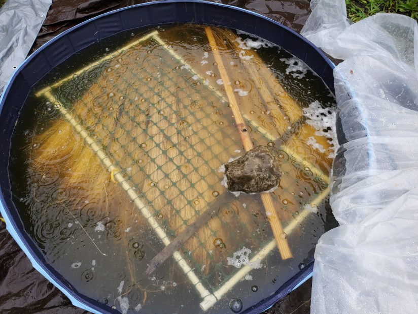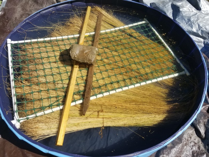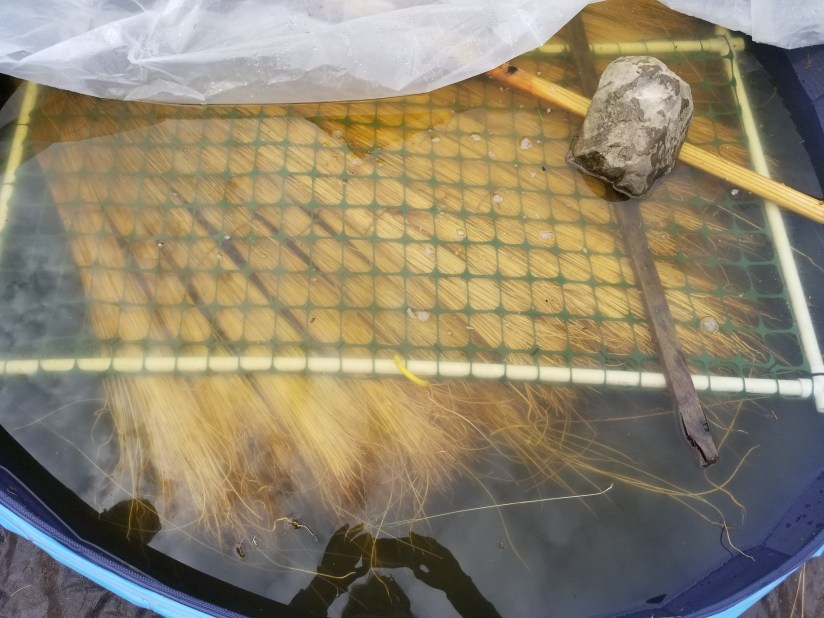It’s day 4 of retting, and things are moving along. The first two days were mid 70s during the day and 60s at night. This helped warm up the water. With the rain, temps have dropped into the 60s with prediction of mid 50’s at night. The colder temps will slow the retting process. I pulled back the sheeting so the rain could top up the water level in the retting pool. In another day or so, I’ll drain some of the water and top off the pool again.