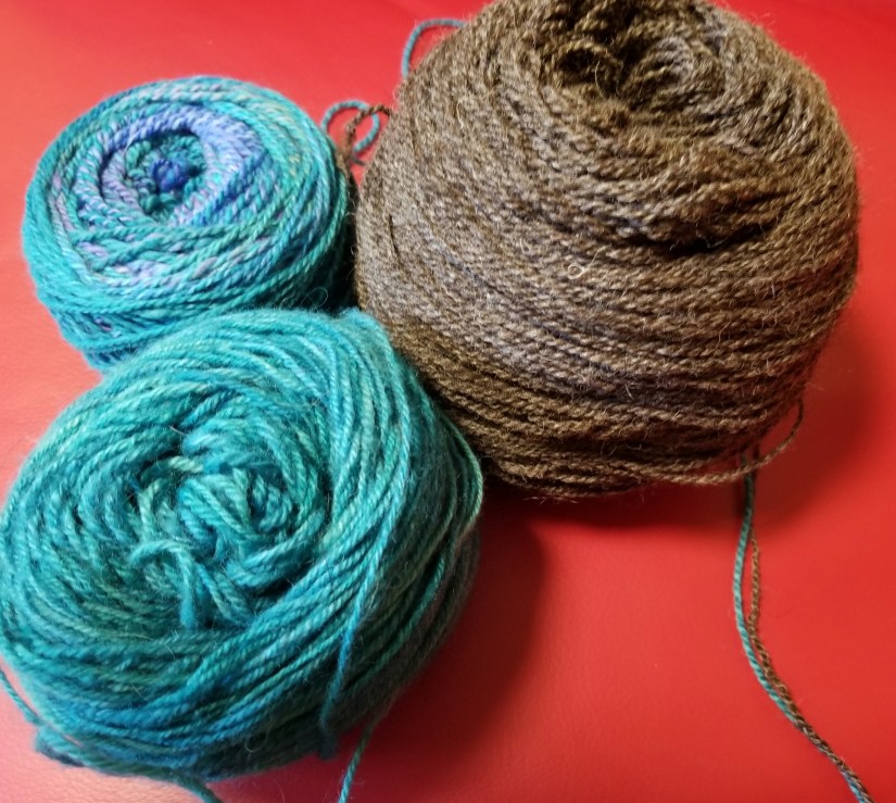 I did some stashdiving and found two 8 oz balls of handspun grey-brown shetland, a partial ball of handspun/hand-dyed turquoise, and a ball of randomly spun purple and blue that was supposed to be felted mittens but looked hideous in the swatch.