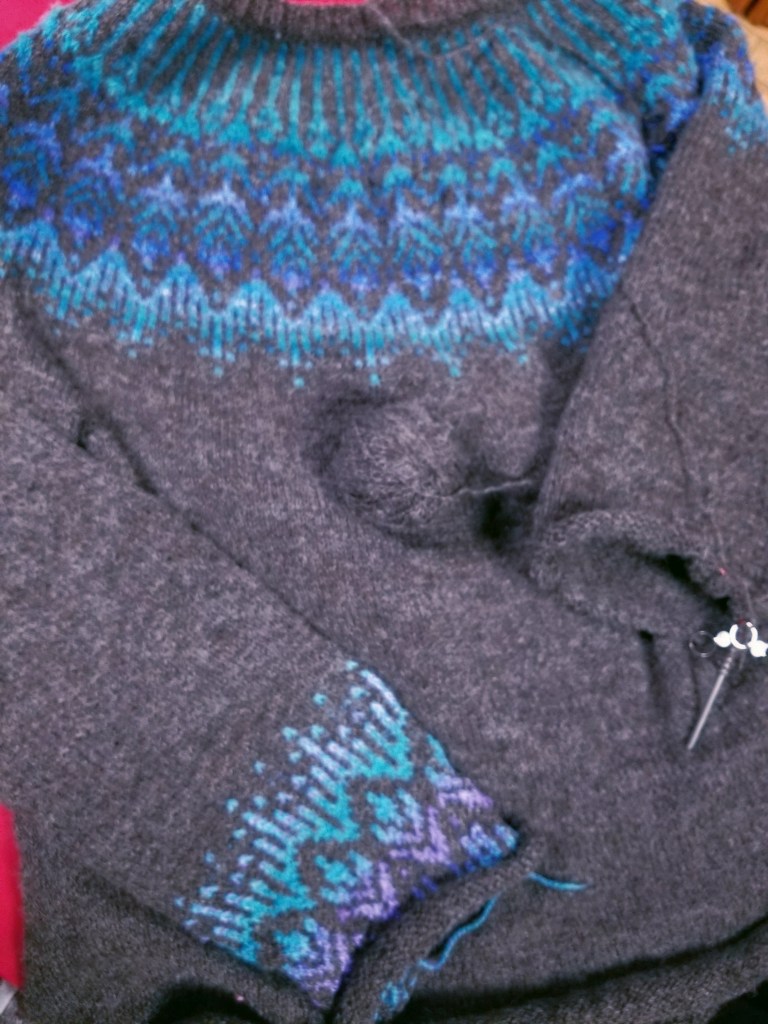 I pulled up the pattern for the Sonrae sweater by Jennifer Steinglass and zipped through the yoke. Yokes are so satisfying! They go fast. Once the guidelines are knitted, the rest is very easy to see as you knit. It’s nice to have the pattern to look at, but hypothetically- if you did something unhelpful like forget your pattern on the table and only have the picture on your phone- you can easily figure out the next section by blowing up the image and following that. It’s two color knitting, so there’s very little yarn management. If the ball rolls under the seat of the car, gets snagged on the seat adjuster rod, and breaks- you can just rejoin and sew that end in later.