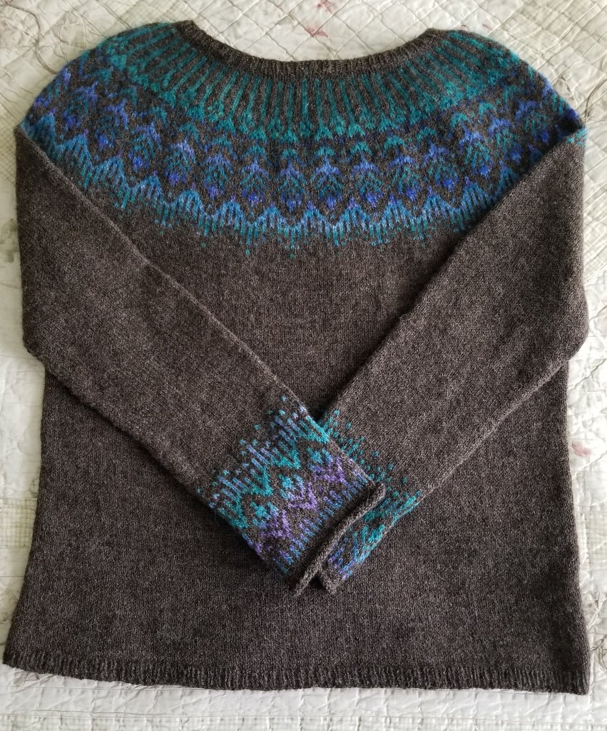 It took a day of two of wearing before the turquoise yarn in yoke settled down. I have broad shoulders, so the extra width from the larger yarn was a good thing there. On the next one, I would use two sportweight yarns so the drape matches the rest of the sweater.