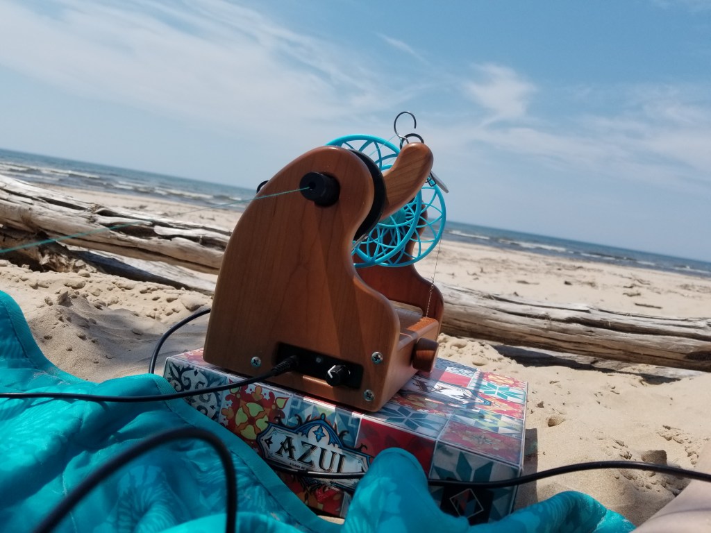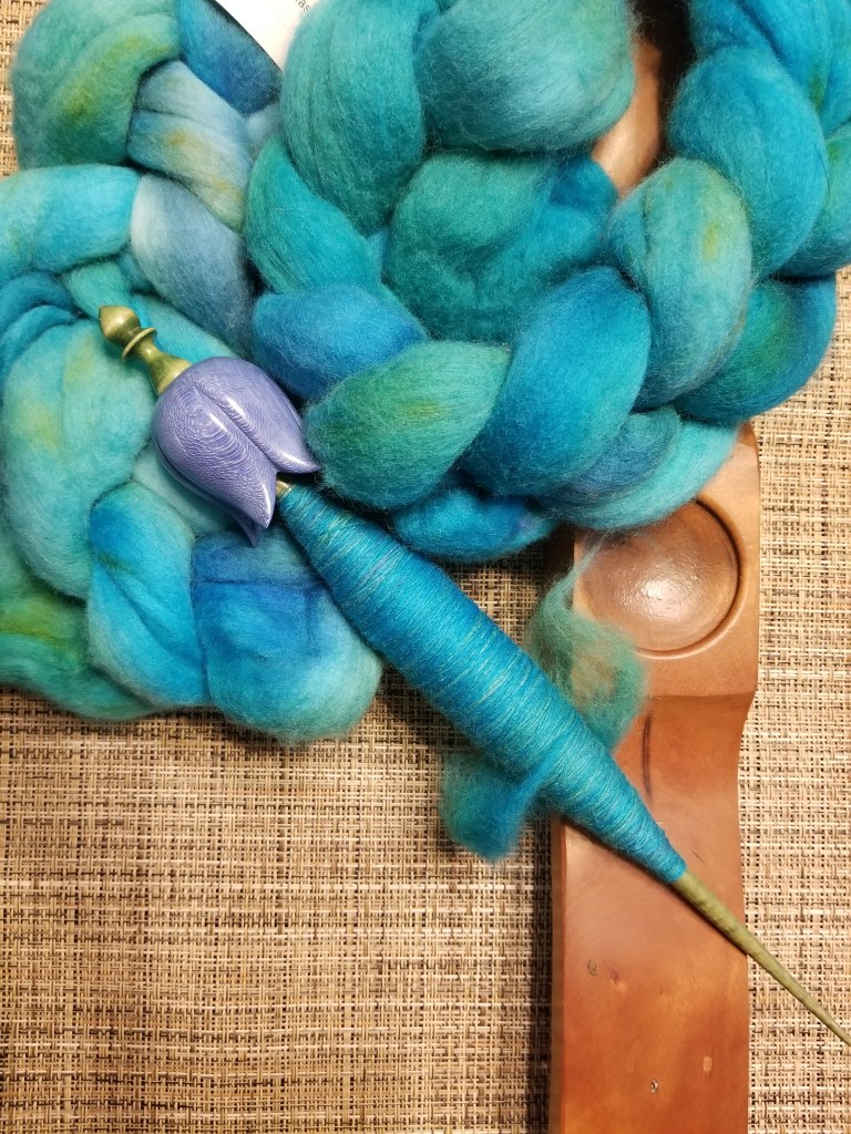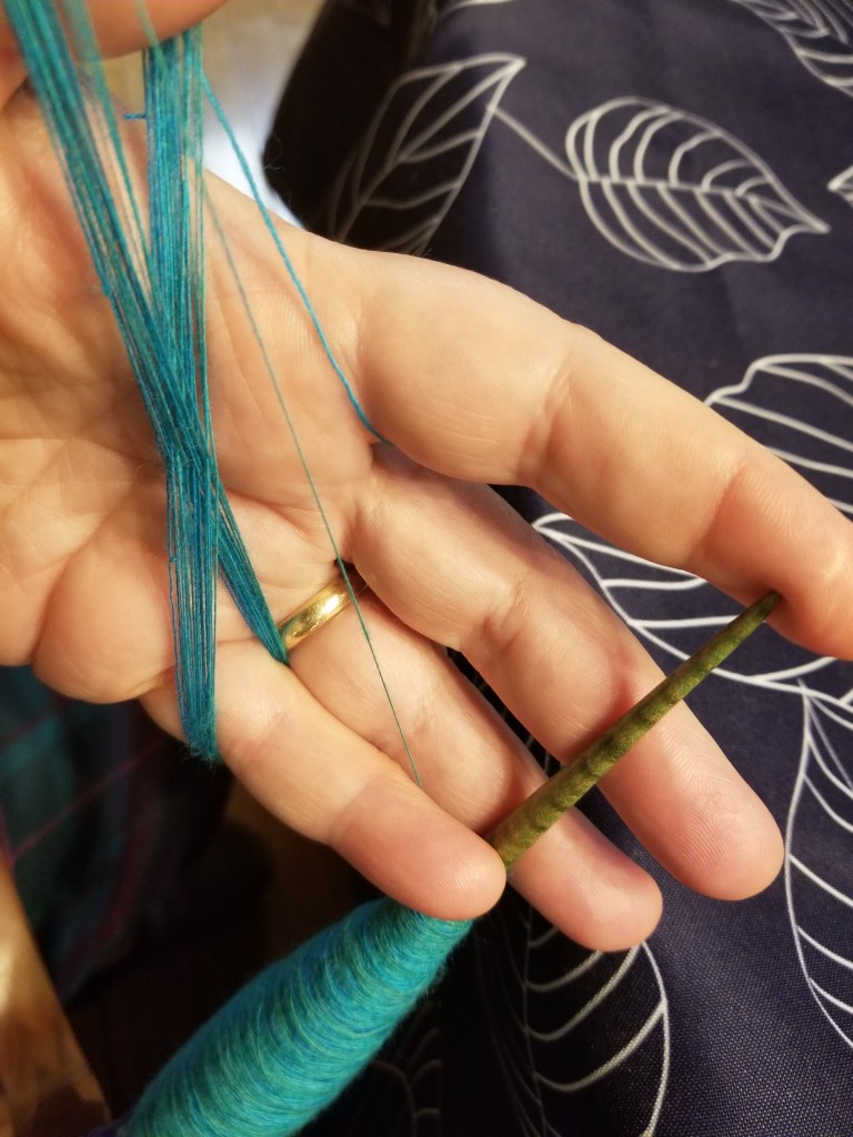 When I reached the end of the braid, I decided to swap over to my minispinner and build up that bobbin to match the spindle cops.