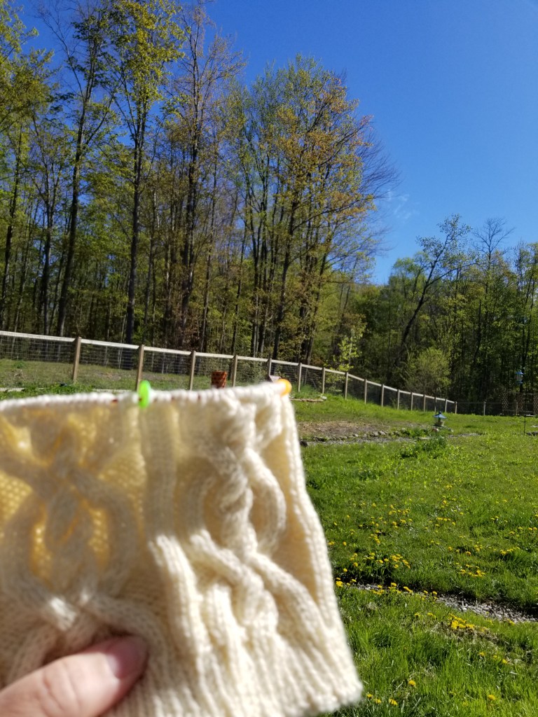 The other con- knitting cables with chain plying. It never fails- the chain bump will land in the center of your largest, smoothest cable. You can break out the bump if it’s very noticeable, but I usually convince myself it will settle out in the block and then regret it later!